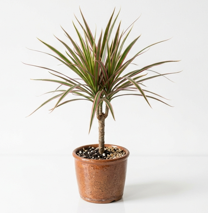 The Dracaena marginata tricolor (also called Madagascar dragon tree) is a beautiful, low-maintenance houseplant with green, cream, and reddish-pink striped leaves.