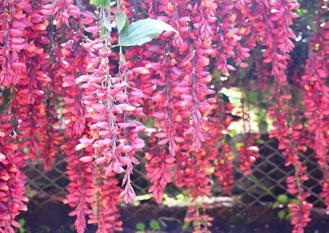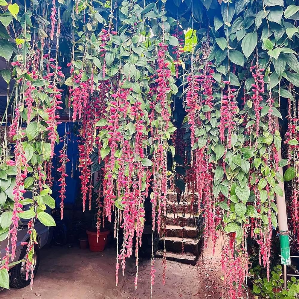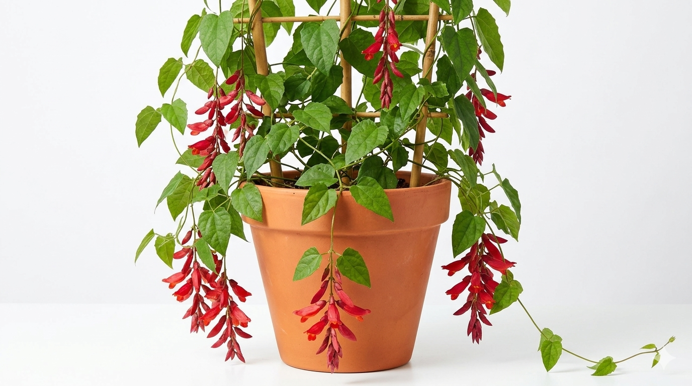 The Scarlet Clock Vine (Thunbergia coccinea) is a beautiful, fast-growing climber with bright red-orange tubular flowers—perfect for pots if you give it support and warmth.