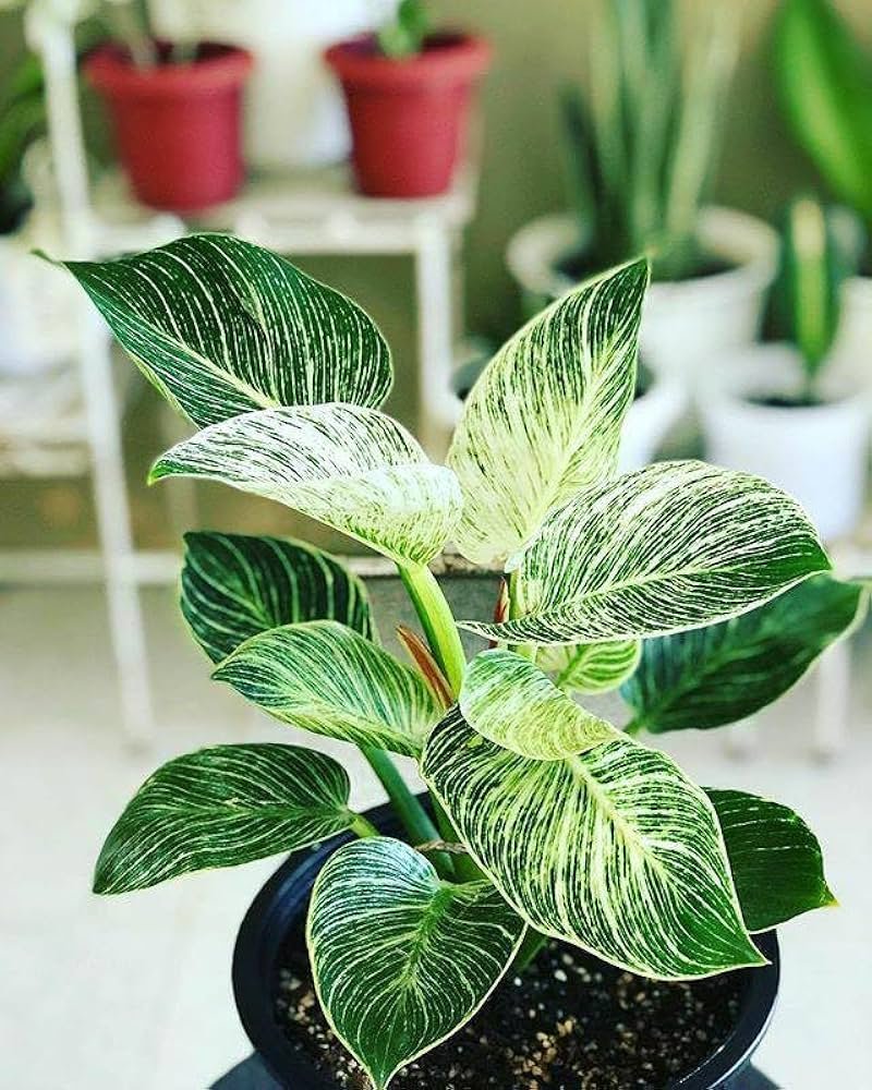 The Philodendron Birkin is a beautiful indoor plant with dark green leaves and creamy white stripes.