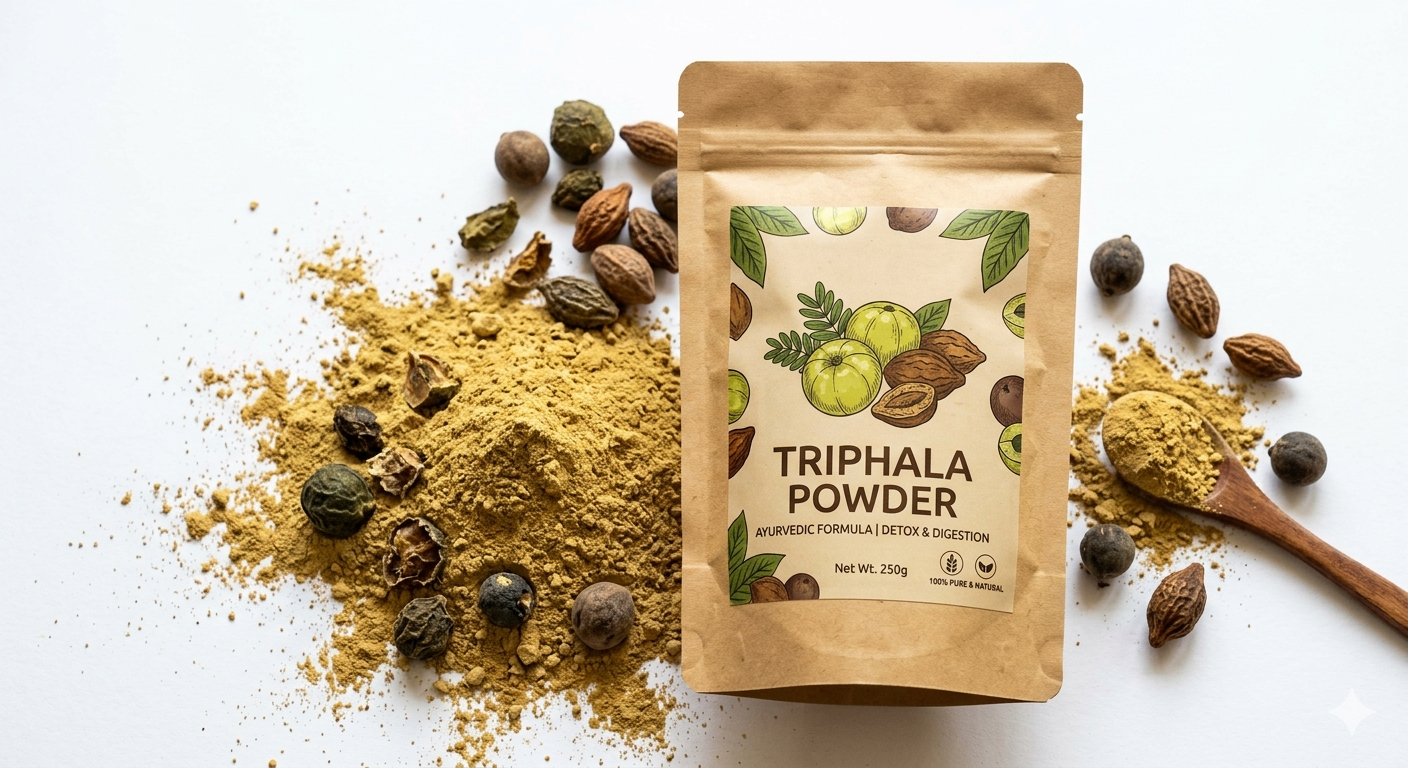 Triphala powder is a traditional Ayurvedic herbal blend made from three fruits — Amla (Indian Gooseberry), Haritaki, and Bibhitaki.