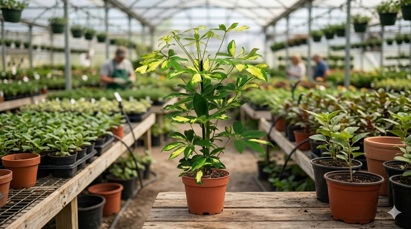 A variegated Schefflera arboricola ‘Gold Capella’ (often called golden schefflera) is fairly easy to grow if you avoid overwatering.
